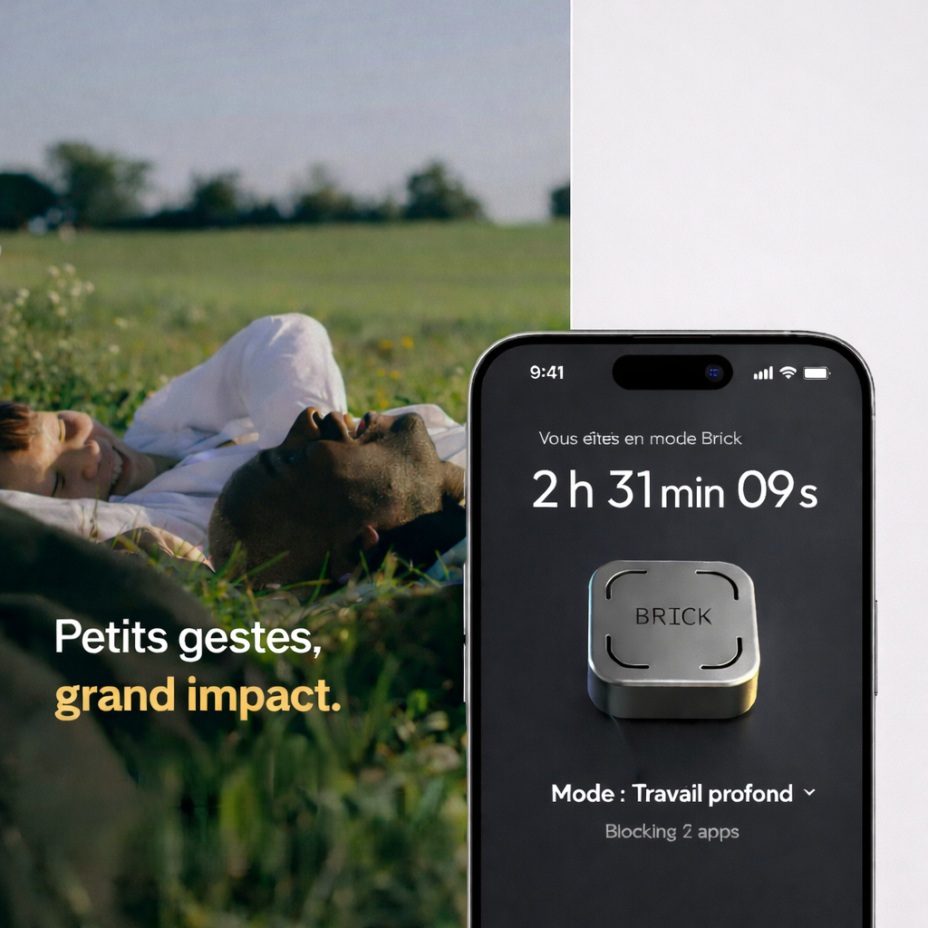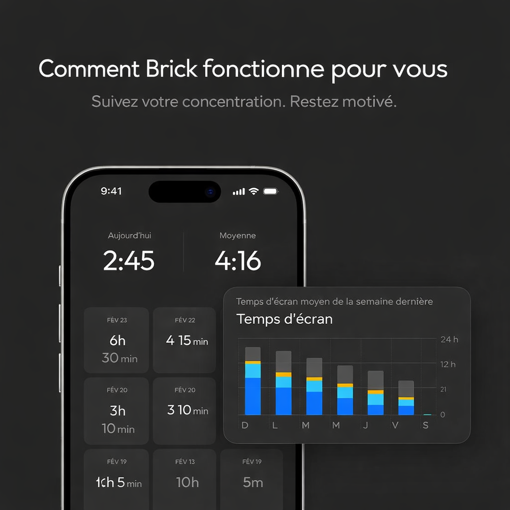 Brick est sans abonnement. Obtenez un accès à vie à notre application Brick sur l'App Store ou le Google Play Store pour bloquer les distractions, définir 10 modes personnalisés et suivre votre utilisation.